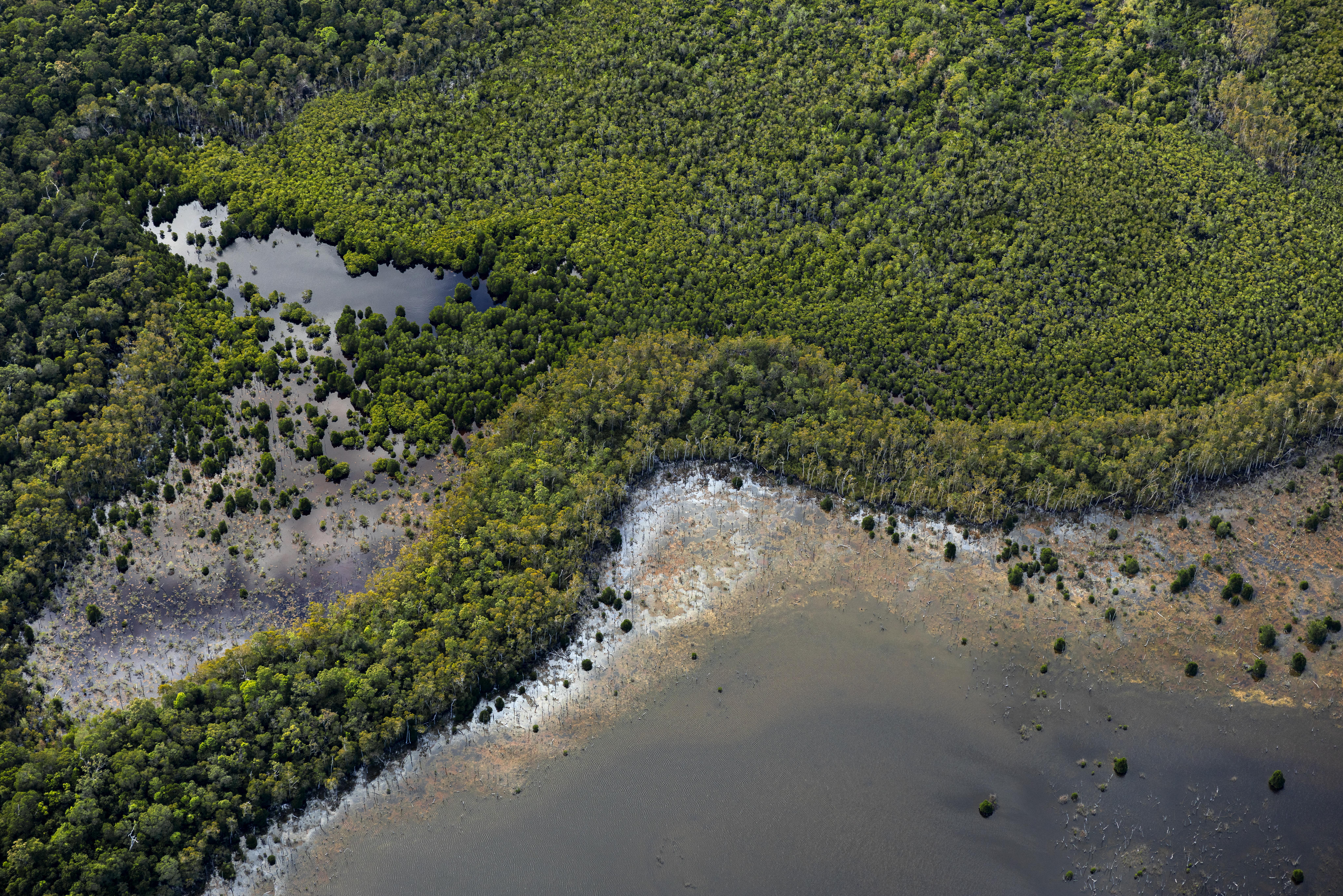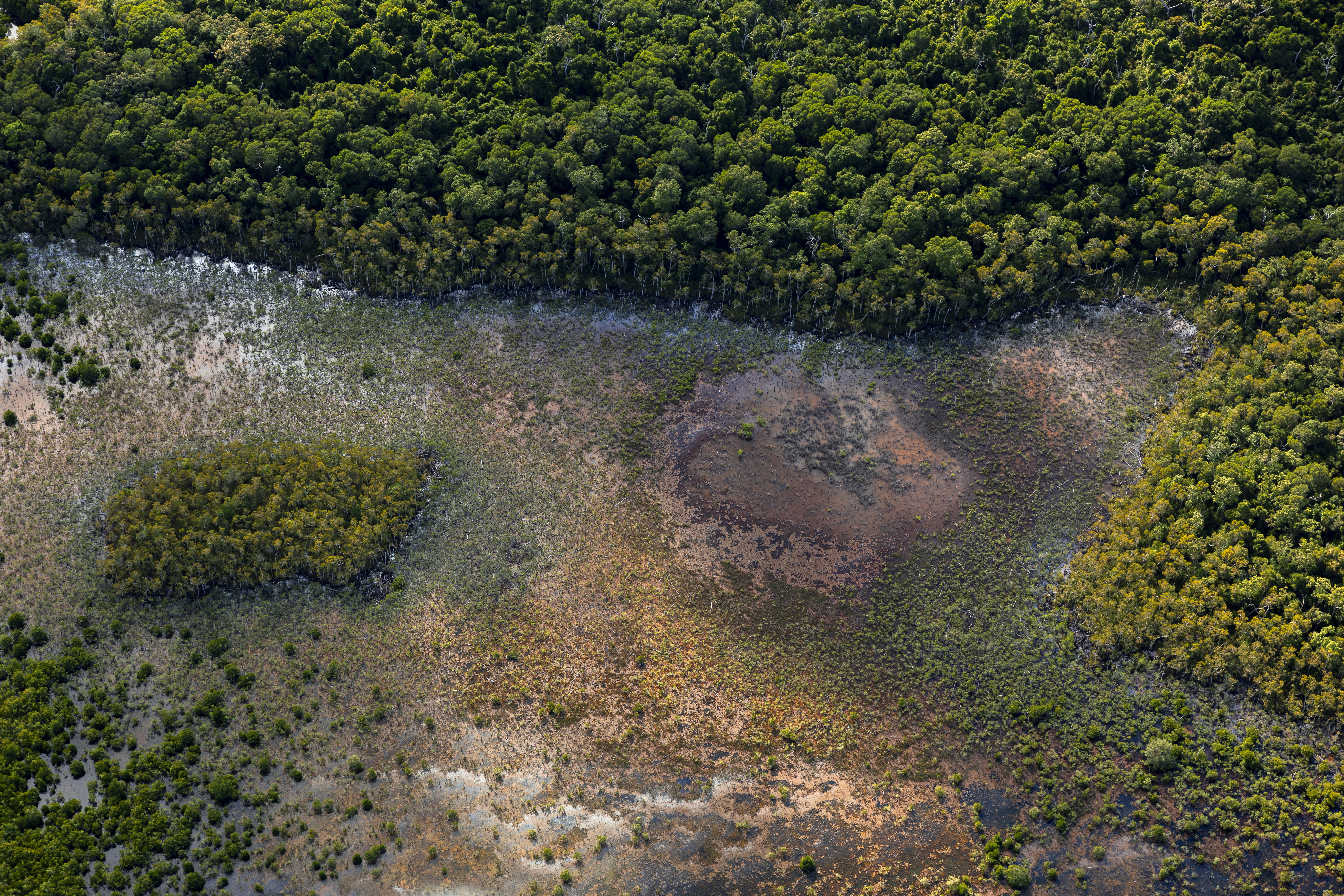 A helicopter trip over the Cassowary Coast area, just south of Innisfail and north of Mission Beach, revealed some vibrant greens bordering meandering river systems and lagoons rimmed with pink to orange algae on the water's surface.